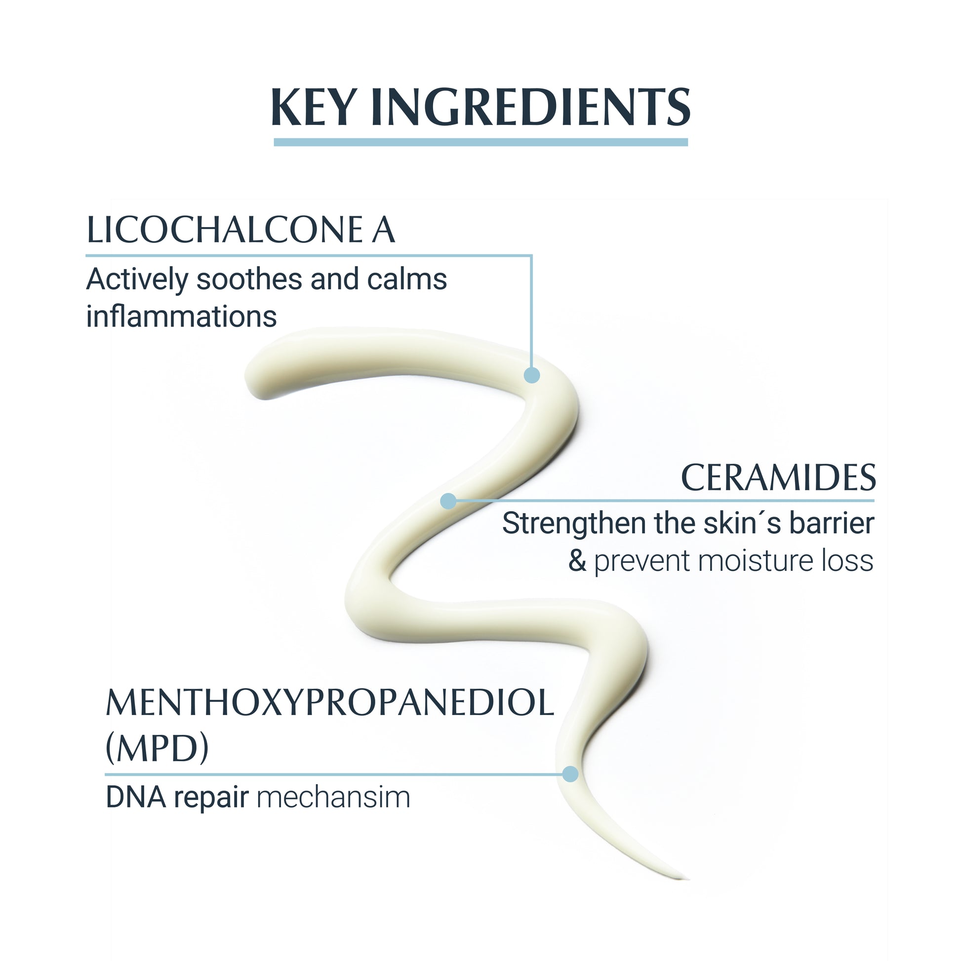 المكونات النشطة الرئيسية: أحماض أوميغا 6 الدهنية المشتقة من النباتات، والتي تعمل على تنعيم البشرة. ليكوكالكون أ، الذي يحارب البكتيريا مع ديكانديول ويخفف الحكة أيضاً.