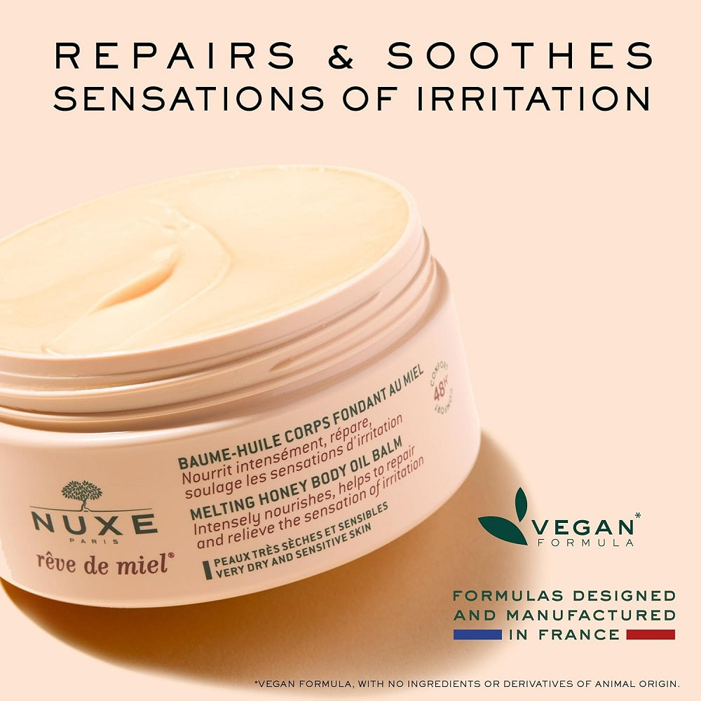 بلسم زيت الجسم المذاب من نوكس، 200 مل، هو بلسم مغذٍّ مُصمَّم بالعسل والزيوت النباتية، مثالي للبشرة الجافة والحساسة. يرطب البشرة بعمق، ويُرمِّمها، ويُهدئ تهيجها، ليتركها ناعمة ومريحة. يتحول قوامه الغني إلى زيت عند وضعه، دون ترك أي أثر دهني، ويتميز برائحة زكية من الميموزا والعسل والفانيليا.
