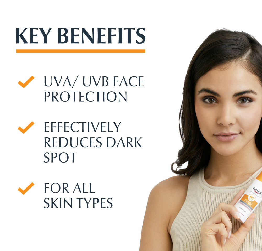 Eucerin Sun Pigment Control Fluido FPS 50+ 50ml é um protetor solar para o rosto, adequado para todos os tipos de pele, que previne a hiperpigmentação resultante da exposição solar.
