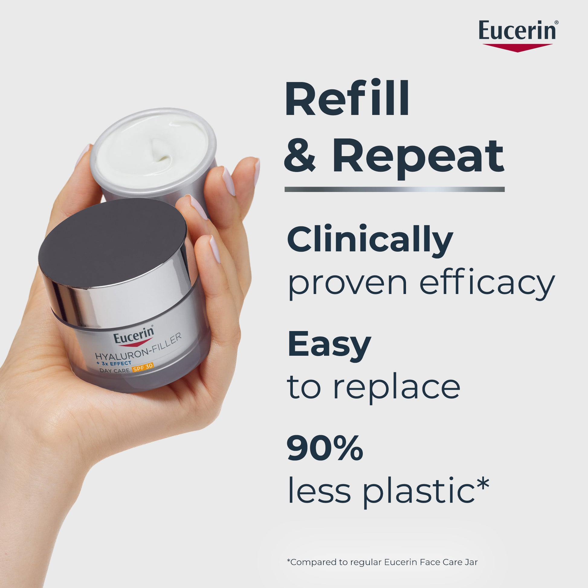 Eucerin Hyaluron-Filler 3x Effect Creme de Dia FPS 30 Recarga 50 ml é um creme de dia antienvelhecimento para todos os tipos de pele, com proteção solar.
