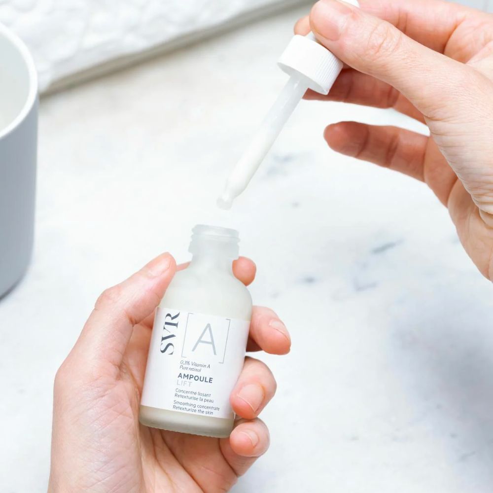 Rotina recomendada: Depois de limpar o rosto, pode aplicar a Ampola SVR [A] Lift para suavizar irregularidades ou outras imperfeições, como poros e rugas. Pode prosseguir com a sua rotina de cuidados de pele e, depois, para uma proteção mais profunda da pele, aplique um protetor solar, com o SVR Sun Secure Extreme SPF50+ que proporciona uma proteção solar ultra-matte de alta cobertura sem deixar uma sensação gordurosa, ou o SVR Sun Secure Easy Stick para uma aplicação rápida em qualquer situação.