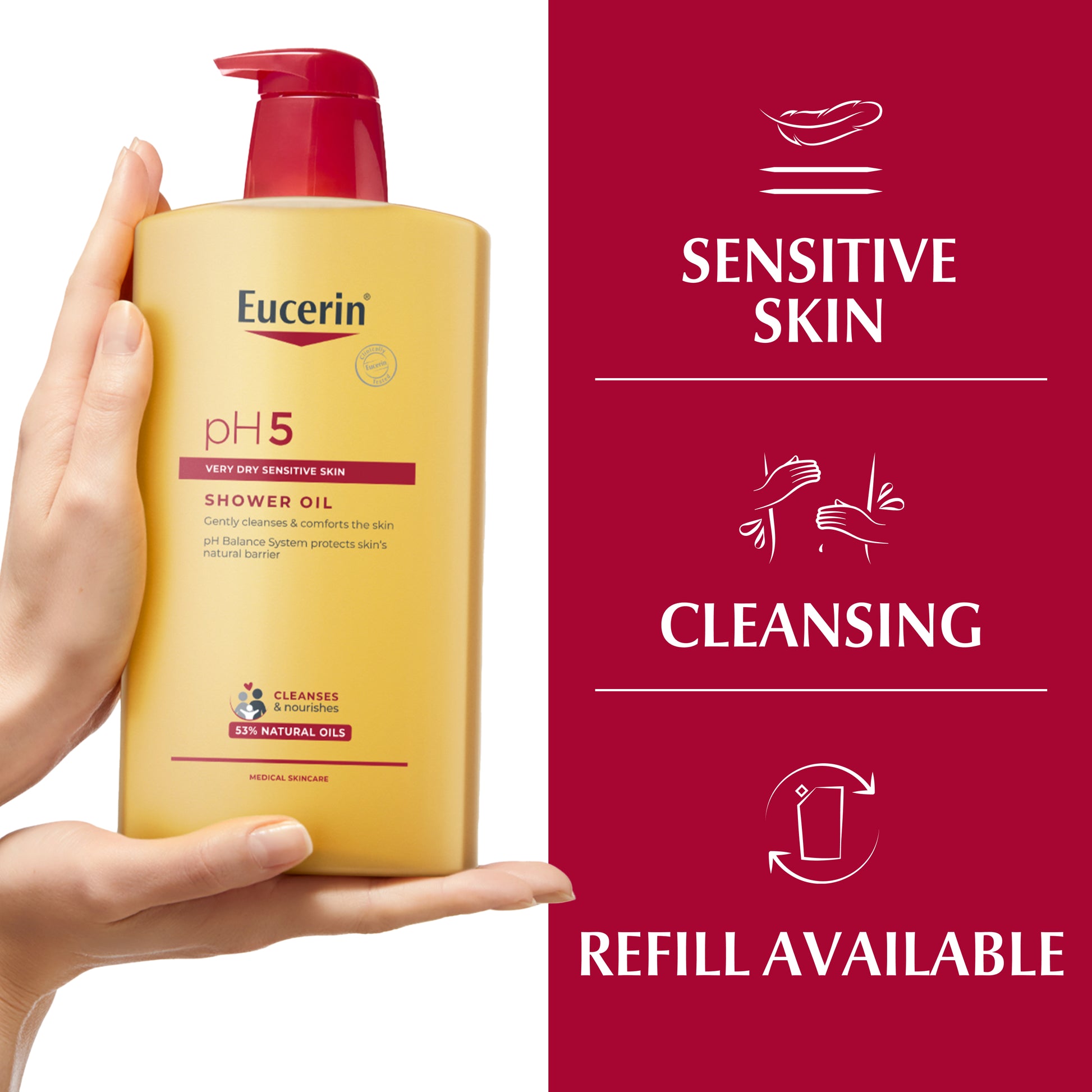 Eucerin pH5 Óleo de Duche 1L é um produto de limpeza de corpo rico e restaurador, de utilização diária, que promove a proteção das defesas naturais da pele.