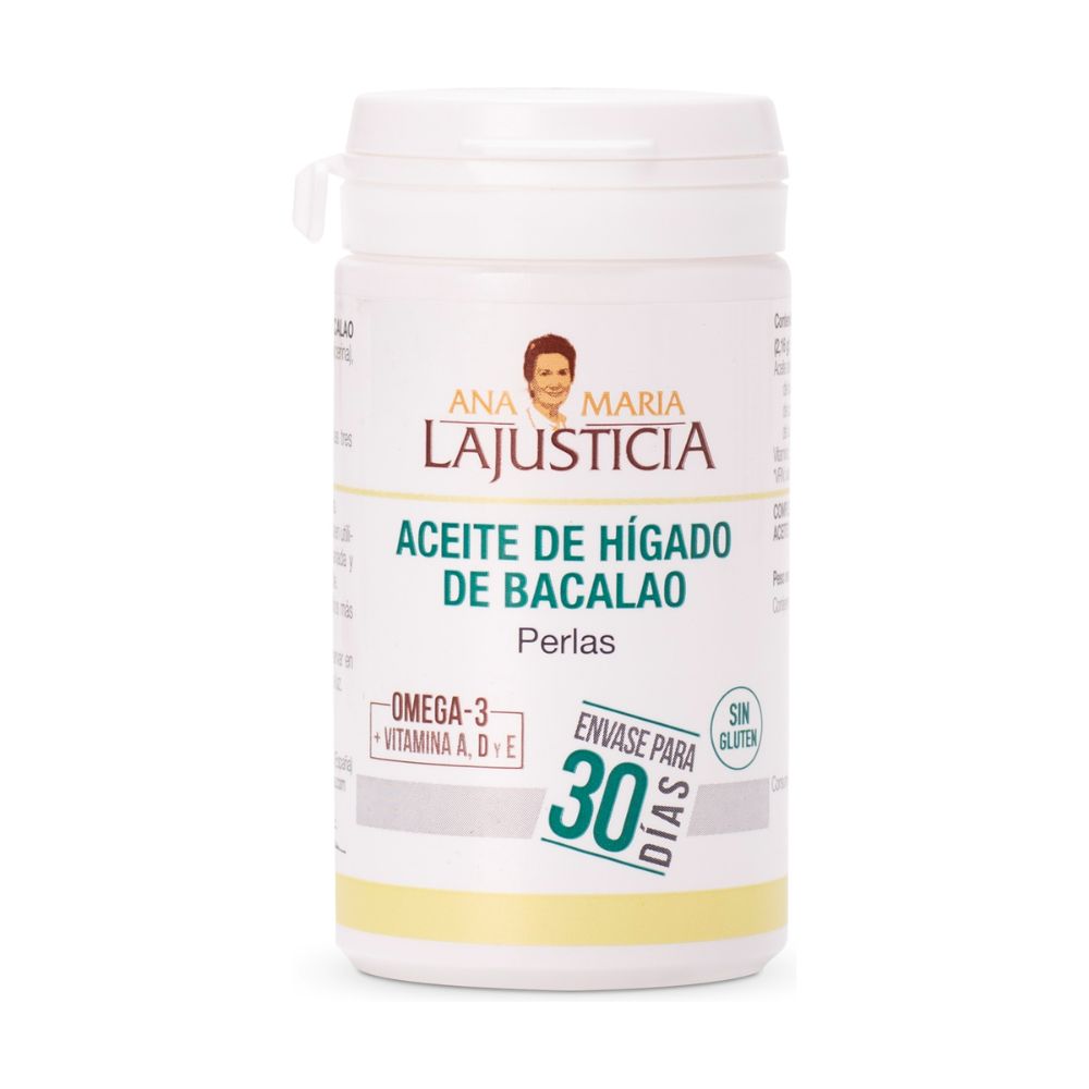 Ana Maria Lajusticia Óleo de Fígado de Bacalhau 90 Cápsulas é um suplemento nutricional rico em ácidos graxos essenciais ômega-3 e vitaminas A e D. Permite um fortalecimento do sistema imunológico, conseguindo assim promover uma melhoria na saúde. Contribui para a manutenção das membranas mucosas, assim como mantém a pele saudável e os olhos em condições normais devido à sua riqueza em vitaminas A e D, que são essenciais para o bom funcionamento do sistema imunológico.
