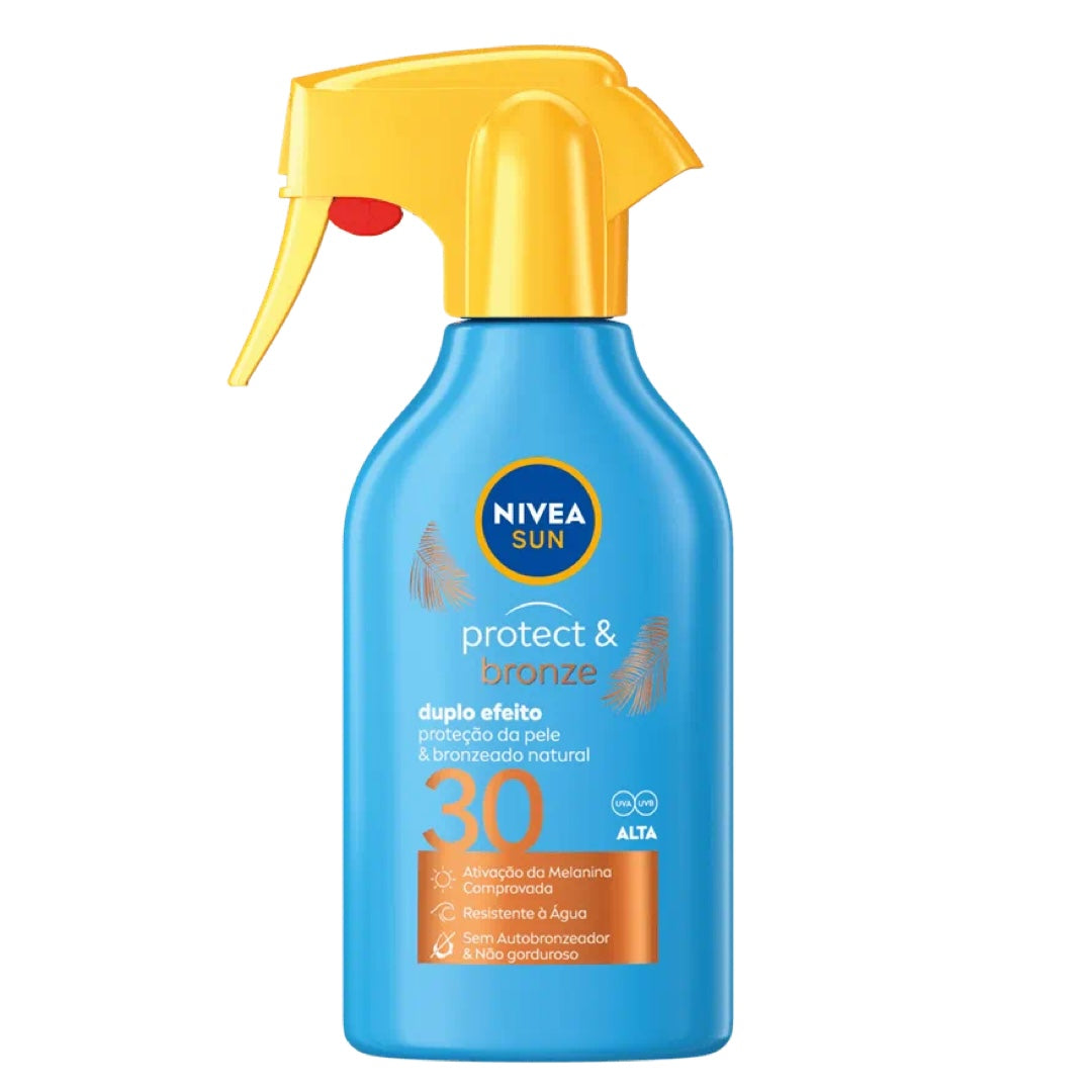 Protetor solar hidratante e resistente à água para um bronzeado bonito, natural e duradouro. Descubra o Spray Protect & Bronze com FP30, em formato familiar. Nivea Sun Spray Protect & Bronze, proporciona um duplo efeito: proteção UV imediata da pele e bronzeado natural graças ao extrato natural de pro-melanina que estimula estimula a melanina da própria pele. Para um bronzeado bonito e saudável. A sua fórmula não gordurosa é resistente à água e não tem autobronzeador. A sua fórmula é 76% biodegradável e respeita os oceanos.